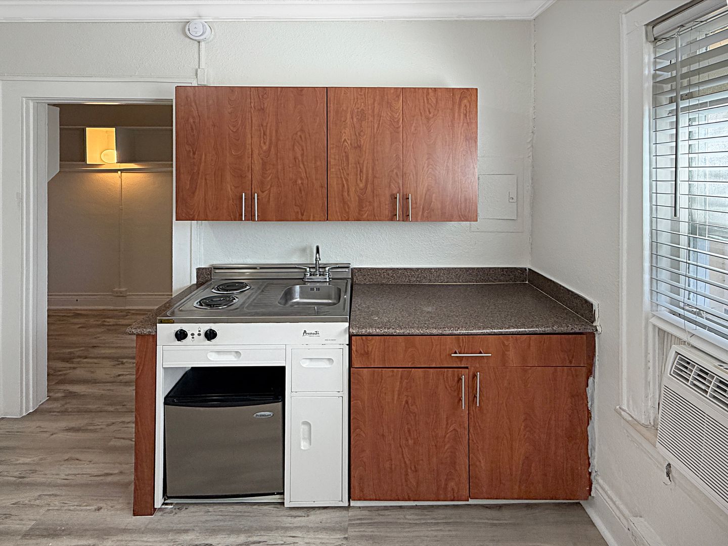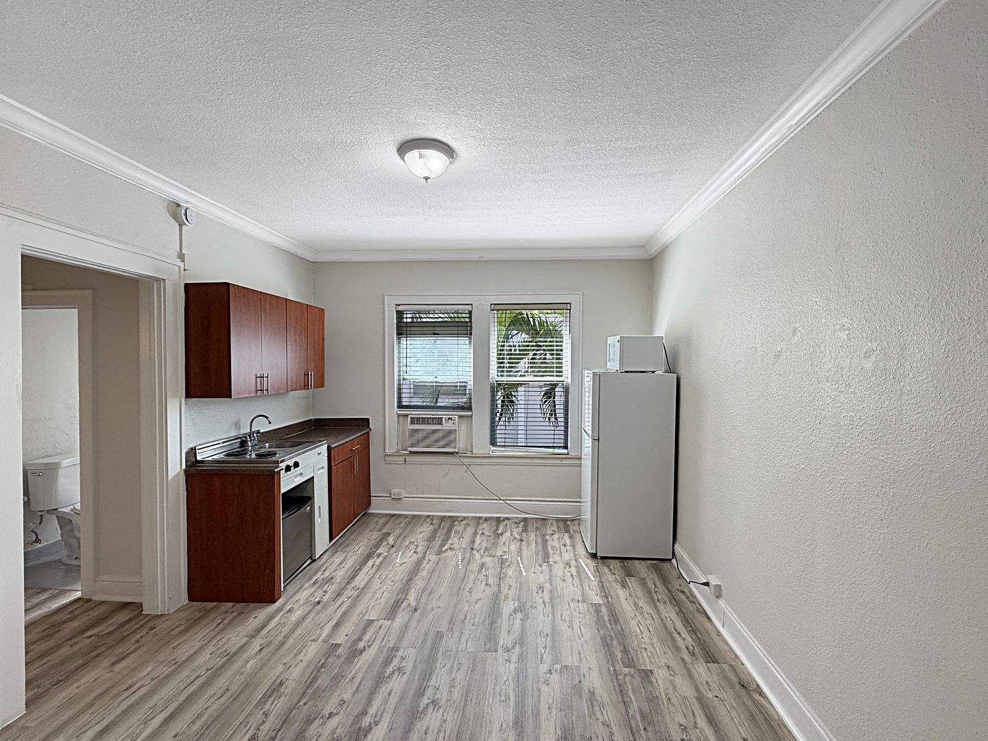 Bright, updated studio featuring modern wood-style flooring, a functional kitchenette, and a refreshed bathroom. Enjoy natural light, ample closet space, and classic Miami charm in a boutique building. Ideal for convenient urban living near Coral Gables, dining, and trolley transit.